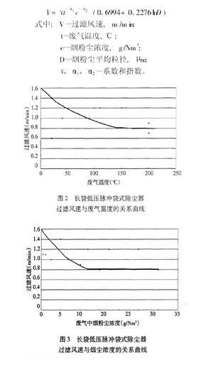 該式雖是通過曲線擬合得到的,但我們在2005年后設(shè)計(jì)脈沖除塵器時(shí),其過濾風(fēng)速的選取均是采用該模式計(jì)算,每臺除塵器的除塵效果都達(dá)到了要求(除塵效率達(dá)到99.9%或排放口濃度小于30g/Nm3)。